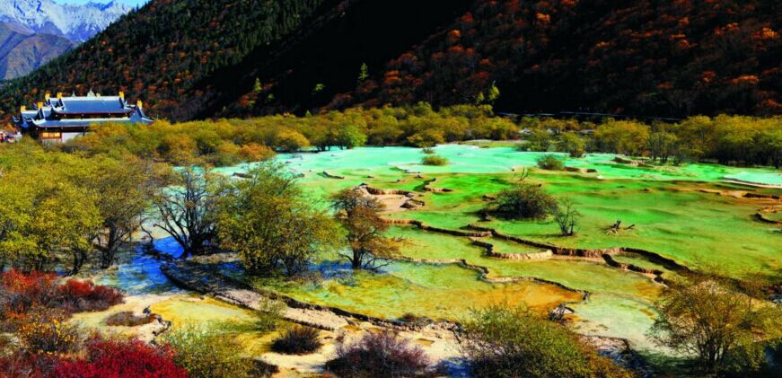 Stunningly beautiful, within the reserve fascinating limestone landscapes dotted with temples and monasteries abound. Known as Se’ercuo in Tibetan, or “golden lake”, it’s easy to see why local Tibetans believe the colorful terraced pools of Huanglong to be a sacred tribute to Mt. Xuebaoding that towers above.